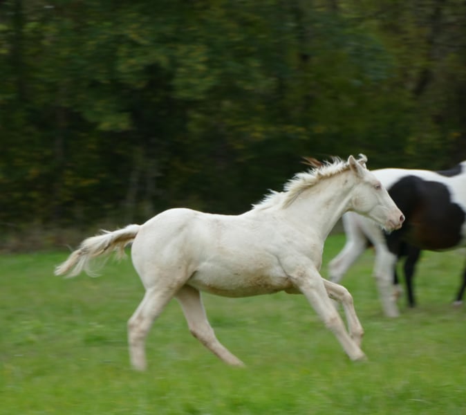 Pouliche cremello testée : AA -ee , de grande taille , beau modèle et super caractère . origines Demi-Sang Tchèque X Selle Français , la souche maternelle est fournie en bons compétiteurs CSO et CCE Hyper intéressante pour l'élevage avec sa taille et son modèle , son tempérament gentil et sa génétique de couleur , elle ne produira que des poulains palominos ou isabelle , pas de qmoky black , elle est en outre porteuse du DW 20 qui donne du blanc large en tête et en balzanes .