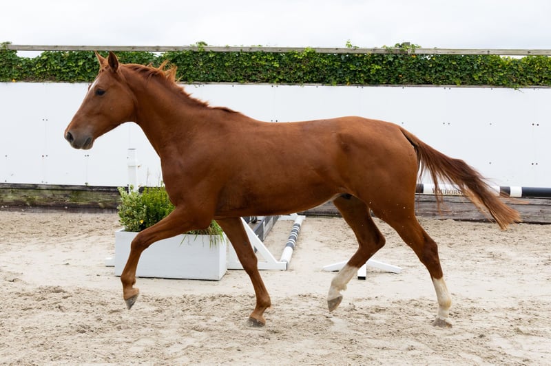 The four-year-old Nash-Faire K Z stands out for his scope over fences. He is cautious, has a manageable temperament, and jumps with good manners. He is also suitable as a hunter or equitation horse. Two half-brothers compete at 1.30m level. His sire, Nashua Z (1.20m show jumping), is an AES-approved stallion by Nabab de Reve out of the 1.60m Grand Prix mare Cruisly, a half-sister to the approved stallions President (1.40m jumping) and Ulysses M2S (1.60m Grand Prix). His dam, Affaire K (Tygo), jumped courses up to 1.30m and is a half-sister to a 1.30m show jumper. His granddam, Urloffine II (Lux Z), competed in 1.35m classes. From the same dam line comes the 1.50m show jumping mare Vantiels Esprit, dam of the KWPN stallion Carrera VDL (1.60m GP) and half-sister to the renowned Tinka’s Boy (1.60m Grand Prix). This horse comes from the stables of one of the Netherlands’ top breeders, who was even honored as KWPN Breeder of the Year. The horses from this breeding program have grown up in a calm and spacious environment, grazing in groups on pastures, allowing them to develop naturally. They have never been trained – they are only halter-trained – and come directly from the breeder. This makes them particularly interesting for those who wish to train a young horse according to their own methods. They are honest, unspoiled, and purely bred, straight from the hands of a reputable breeder.