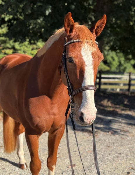 "Falcon" has all the chrome and all the brains. He is an exceptional prospect that has endless scope and talent to be a competitive horse for any ring. He is extremely brave and always takes each ride with a positive attitude. This horse would be perfect for an ambitious Junior or Amateur who wants a fun prospect to grow with in a program. Falcon is currently jumping up to 2'6" courses and is started on lead changes. He has jumped all new jumps without batting an eye and has been introduced to fillers. Falcon is as fun to ride as he is to have in the barn. He stands well for the farrier, vet and is wonderful to trailer. He loves to be loved on and will gladly rest his head in your hands, stand all day to be groomed and loves his baths. He has been schooled off property in Europe and settled in from import extremely well and quick. Great recent x-rays on file. Richmond, VA - UTD on everything. *Price will go up with experience.