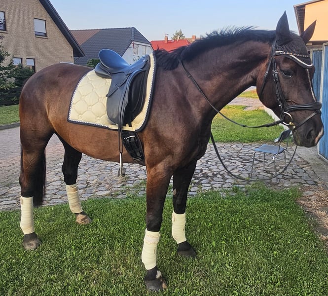 Aus privaten Gründen muss ich schweren Herzens meine 8 jährige Stute Elani verkaufen. Elani ist 1,67 cm groß und eher der sportliche Typ. Sie muss in erfahrene Reiterhand und noch weiter gefördert werden. Sie hat viel Go, daher ist sie definitiv kein Anfängerpferd und Schulbetriebe brauchen sich auch nicht melden. Sie ist geritten, longe kennt sie, Geländesicher, vor ein paar Jahren wurde sie auch mal an der Kutsche angelernt aber das wurde nicht weiter gefestigt. Da übernehme ich keine Haftung. Ich möchte für sie ein tolles Zuhause auf Lebenszeit finden. Sattelzeug ist auf sie angepasst und kann alles zusätzlich erworben werden. Elani geht alleine auf den Hänger und beim Schmied ist sie auch artig. Mir ist es eine Herzensangelegenheit, dass Sie in die richtigen Hände kommt. Daher gilt: Lebensqualität vor Kaufpreis