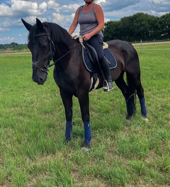 Zum Verkauf steht eine 11 jährige Rappstute, 1,63 m groß und deshalb für Umsteiger besonders geeignet. Sie ist seit 4 Jahren in unserem Besitz und wurde davon 3 Jahre überwiegend von Reitanfängern geritten. Seit Mai 2025 wird sie in der Dressur und im springen weiter gefördert und entwickelt sich täglich weiter. Zweimal wurde sie auf einem internen Turnier vorgestellt, Ende 2025 hat sie dann an einem 60 und 80 cm Springen auf einem öffentlichen Turnier teilgenommen. Im Gelände in der Gruppe ist sie sehr entspannt und unerschrocken, mit ihr macht ausreiten einfach nur Spaß. Wir wünschen uns für sie einen Menschen, der Spaß hat sich gemeinsam mit ihr weiterzuentwickeln. Eine aktuelle AKU aus Dezember 2025 mit Röntgenbildern liegt vor. Bei Interesse und zum Probereiten melden sie sich gerne unter folgender Telefonnummer 0160-99016246
